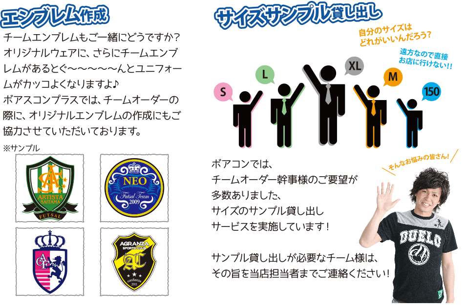 徹底的にこだわる人も、むしろお任せしたい人も、ボアコンにご相談ください!これまでに数多くのチームオーダーユニフォームの制作・販売実績があります。チームオーダーのこと、注文~納品までの流れ、制作期間、商品の在庫、価格や送料、割引のことなどどんなご相談も無料です。チームオーダーをお考えの方には「サイズサンプル」の貸し出しや、エンブレム作成も実施していますので、下記よりご連絡ください。