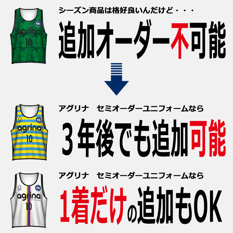 agrina / アグリナ ビブス 3Dシミュレーター3Dシュミレーションをして、あなたのお気に入りのデザインを作り上げてください。色替、エンブレムの変更や番号カラーの変更が、あなたの好きなタイミングで、好きなだけ行うことが出来ます。あなたのお好みのデザインをチームメイトと一緒に追及してください!可能性は無限大!