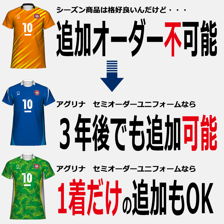 agrina / アグリナ ユニフォーム 3Dシミュレーター3Dシュミレーションをして、あなたのお気に入りのデザインを作り上げてください。色替、エンブレムの変更や番号カラーの変更が、あなたの好きなタイミングで、好きなだけ行うことが出来ます。あなたのお好みのデザインをチームメイトと一緒に追及してください!可能性は無限大!